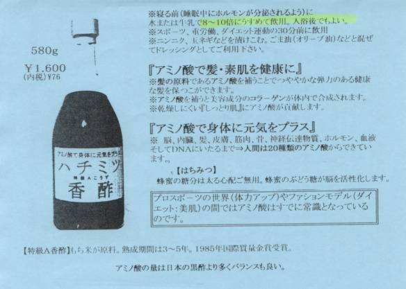 はちみつ34%、香酢66% 飲みやすい香酢です。 特級A香酢は、1985年フランスの国際質量金賞を受賞! 香酢はもち米から作られるお酢で、普通のお酢と比べて香りが強く、まろやかな酸味を持っています。香酢に含まれているアミノ酸は、日本の黒酢よりバランス良く多く含まれています。最近は、体にやさしいダイエット食品として注目を浴びています
